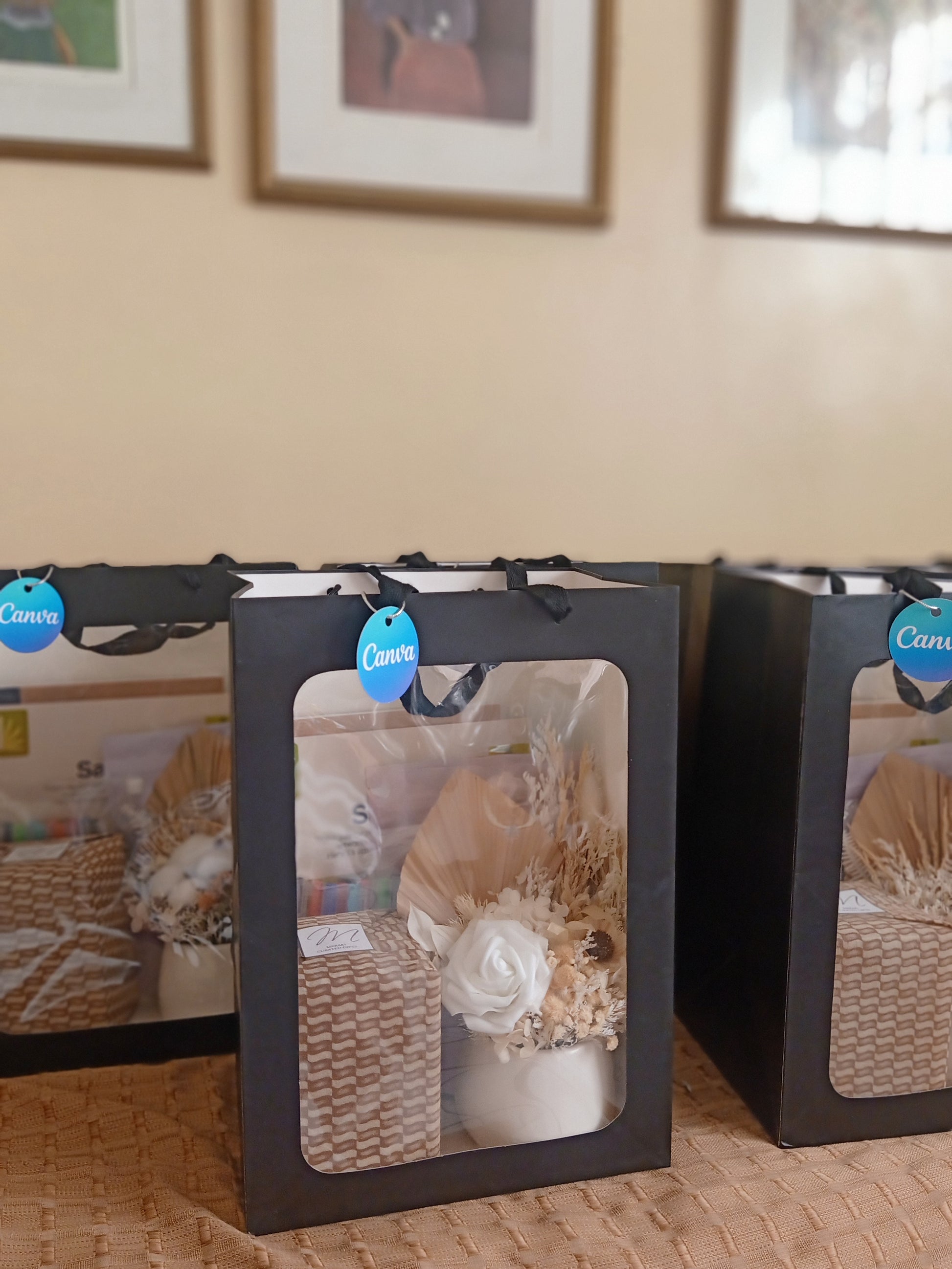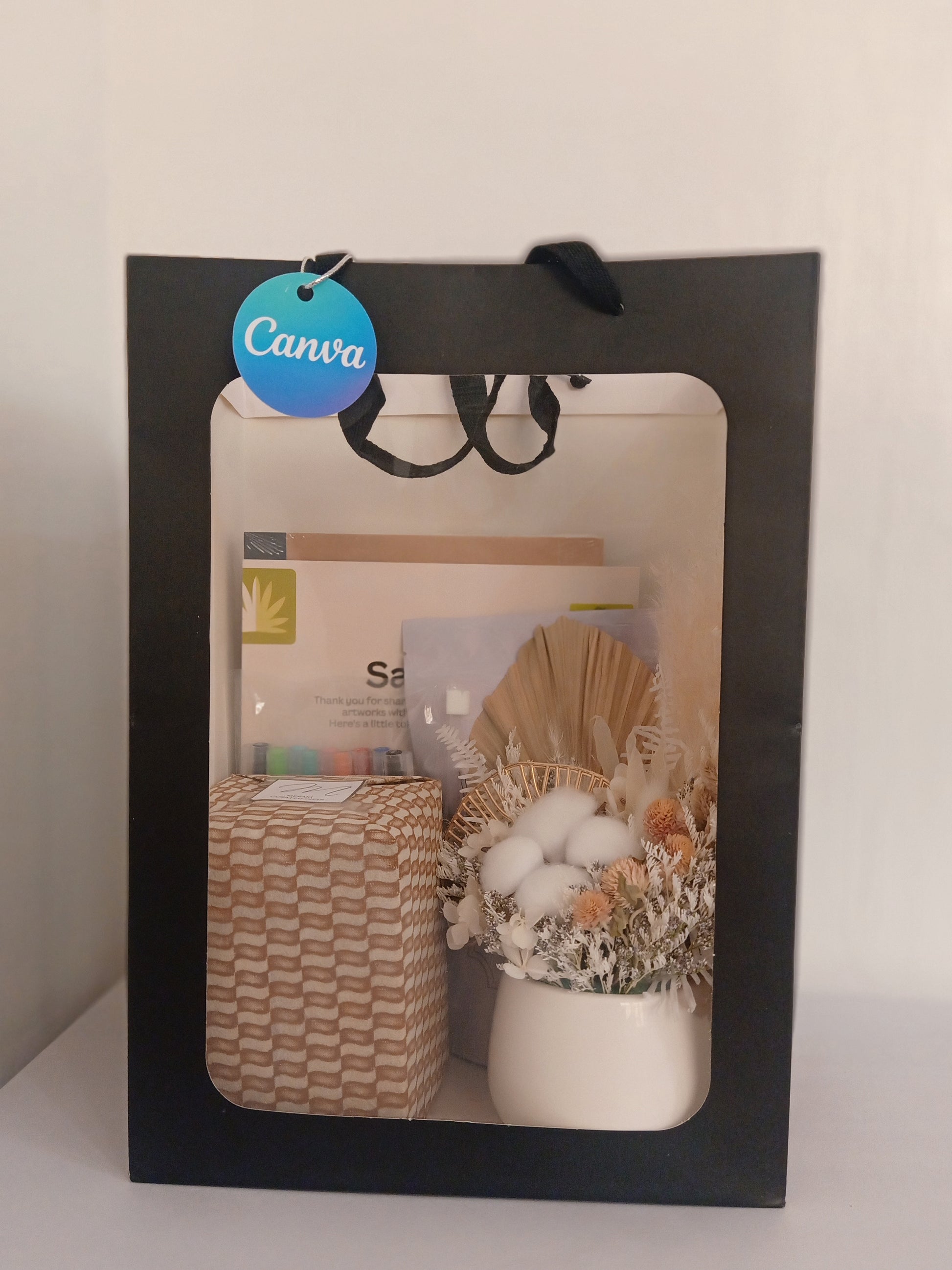 Yes, not all gifts need to be in a box! 🤍 With a beautiful dried flower in a vase, we knew we had to showcase it in a paper bag with a window. Also included are Muji colored pens, a notebook set, a custom engraved mug, and Belgian chocolate potato chips, made especially for Canva's artist.