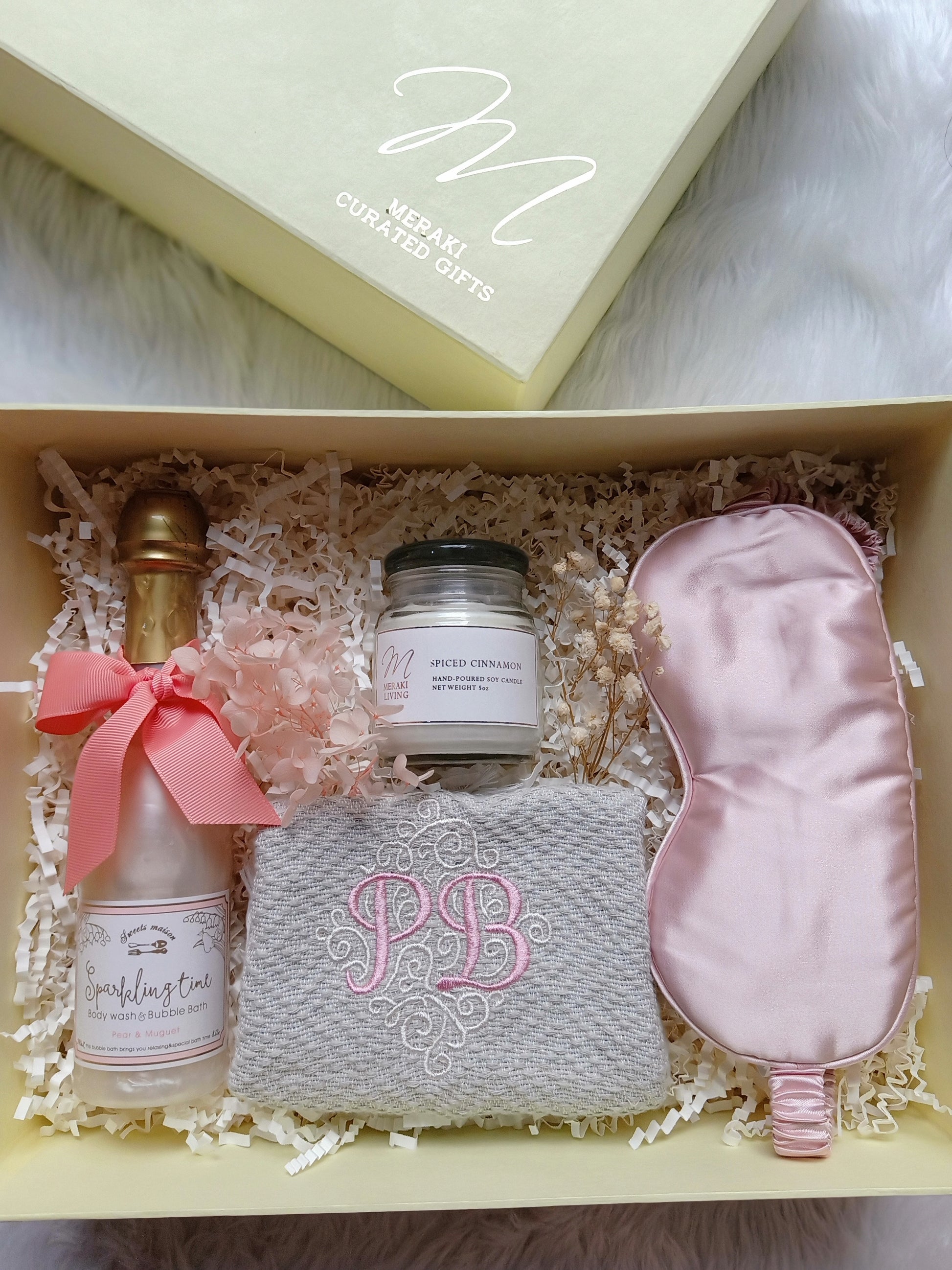 Made for a Pamper Party, these kits were given out to the bride's girlfriends. includes an embroidered hand towel, shower gel, silk scrunchie and eye mask, and a soy candle.