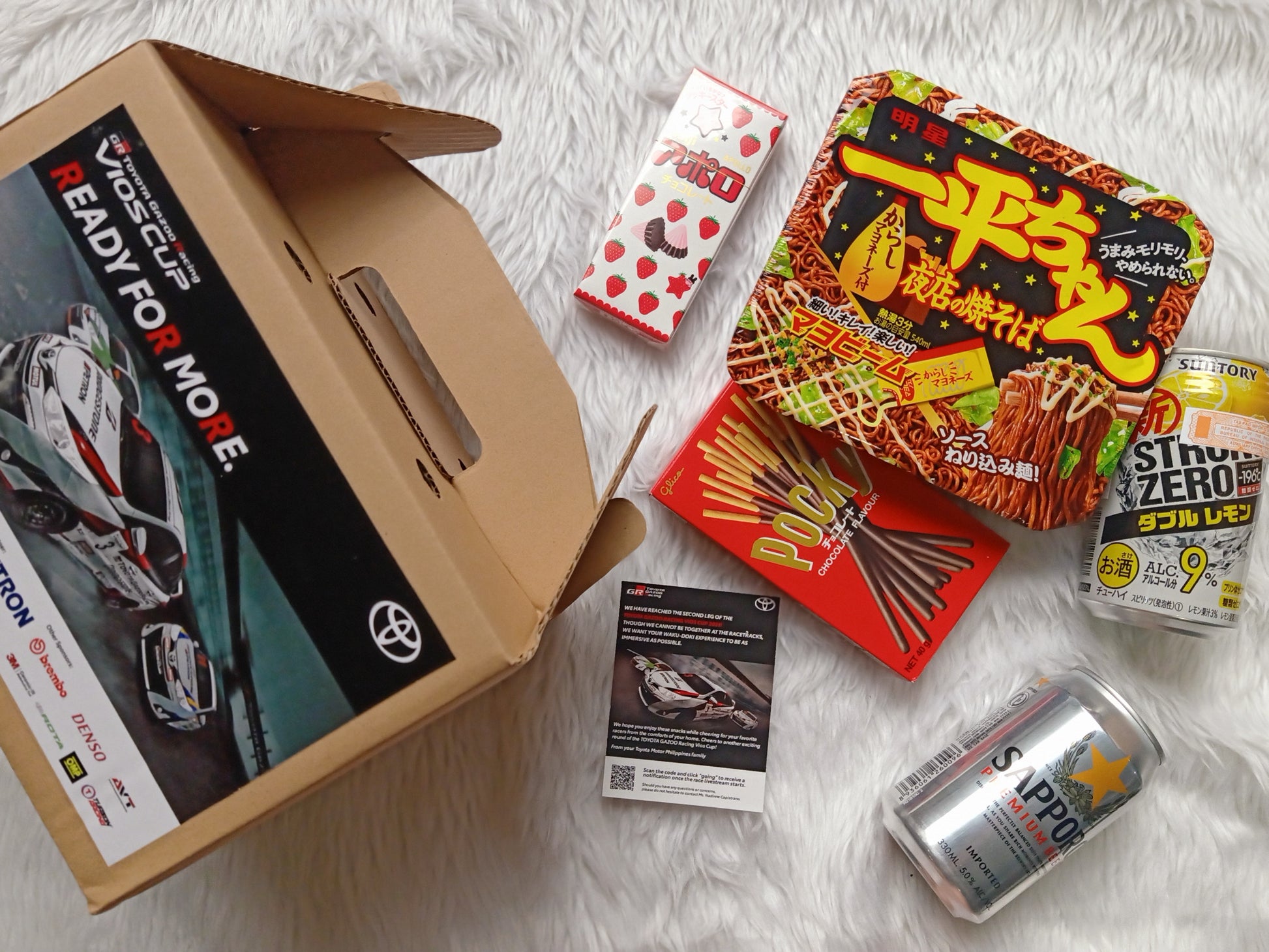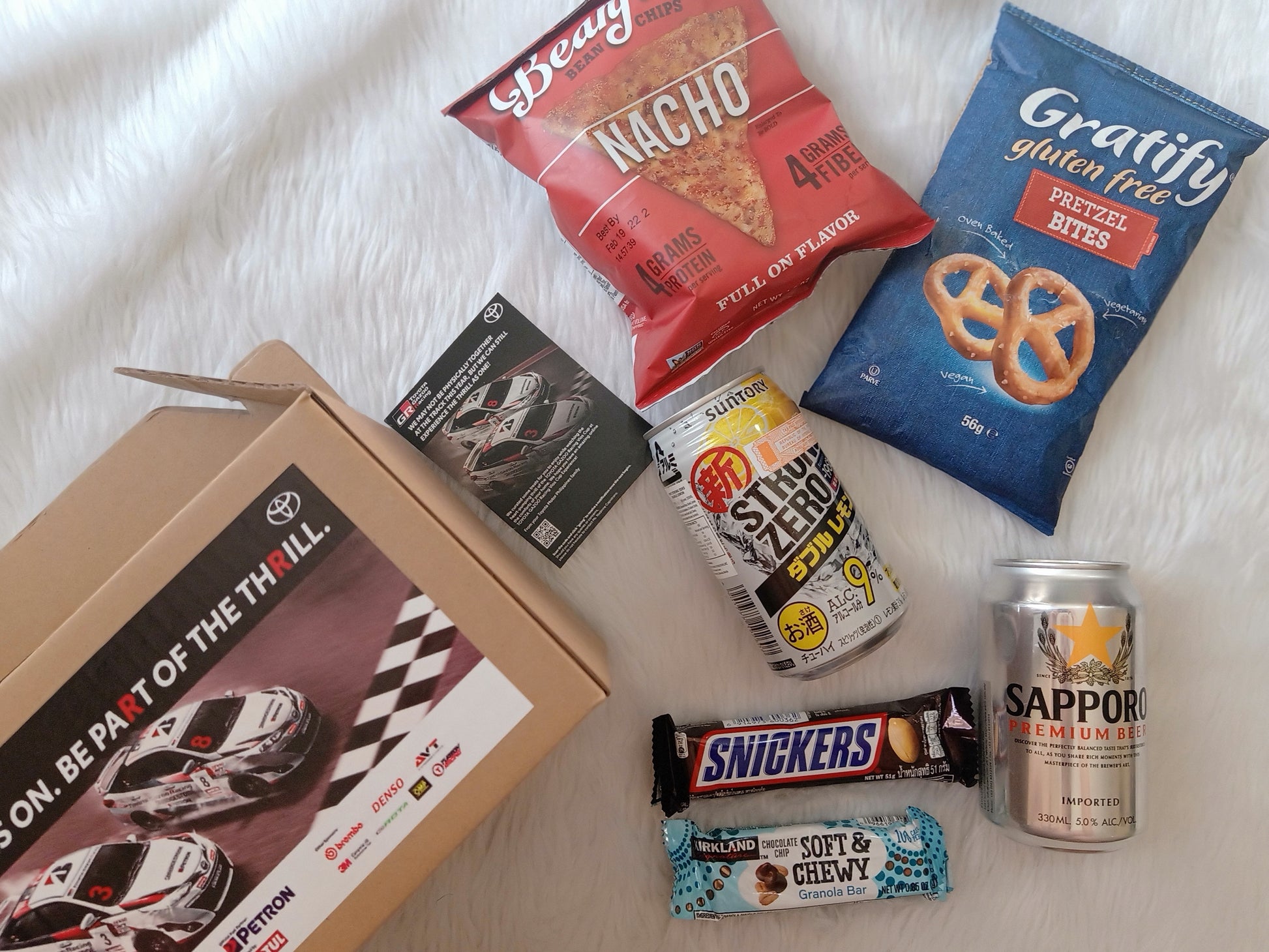 Snack Kits made especially for the watch party of Toyota's Vios Cup! Tune in to the race, munch on some unique Japanese and American snacks, and cheers on your favorite drink.
