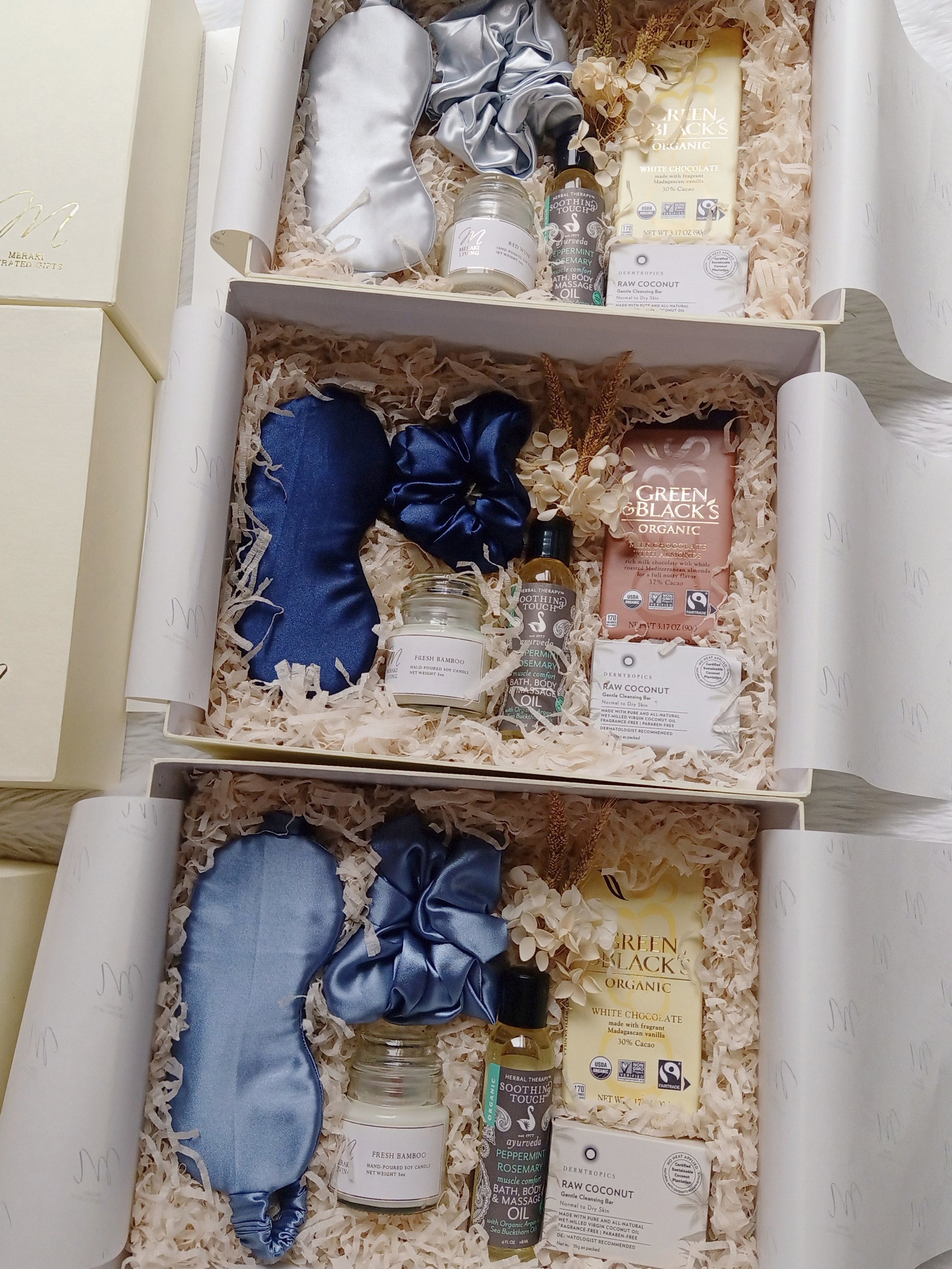 The weekend calls for a well-deserved rest! Take it slow and unwind; this set includes a silk eye mask and scrunchie, a mini soy candle, a chocolate bar, and a Dermtropics coconut bar.