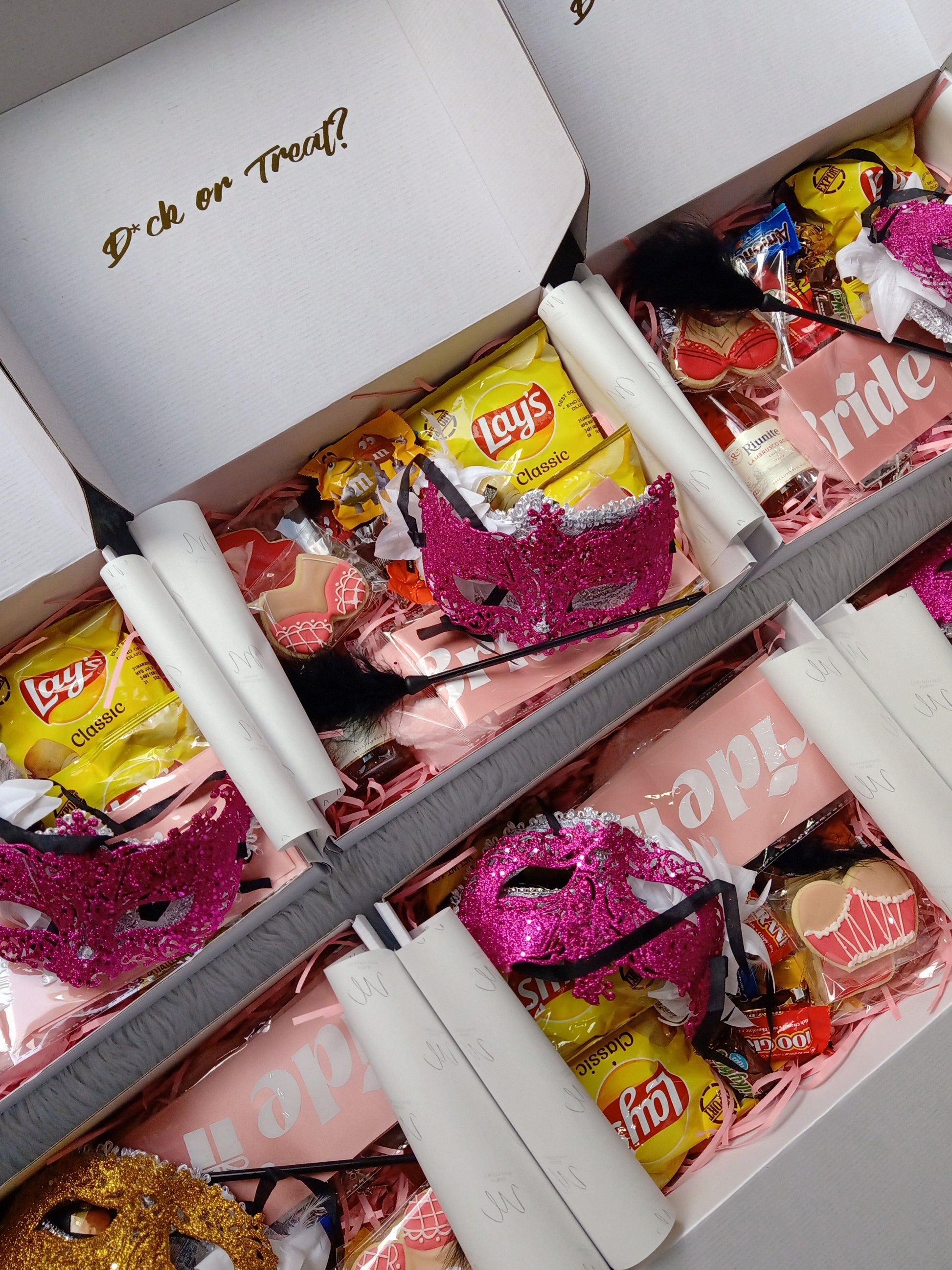 What happens when your bachelorette and Halloween coincide? Throw a masquerade ball! From fun-size chocolates, chips, NSFW items, and custom lingerie cookies, it's all in this gift. š